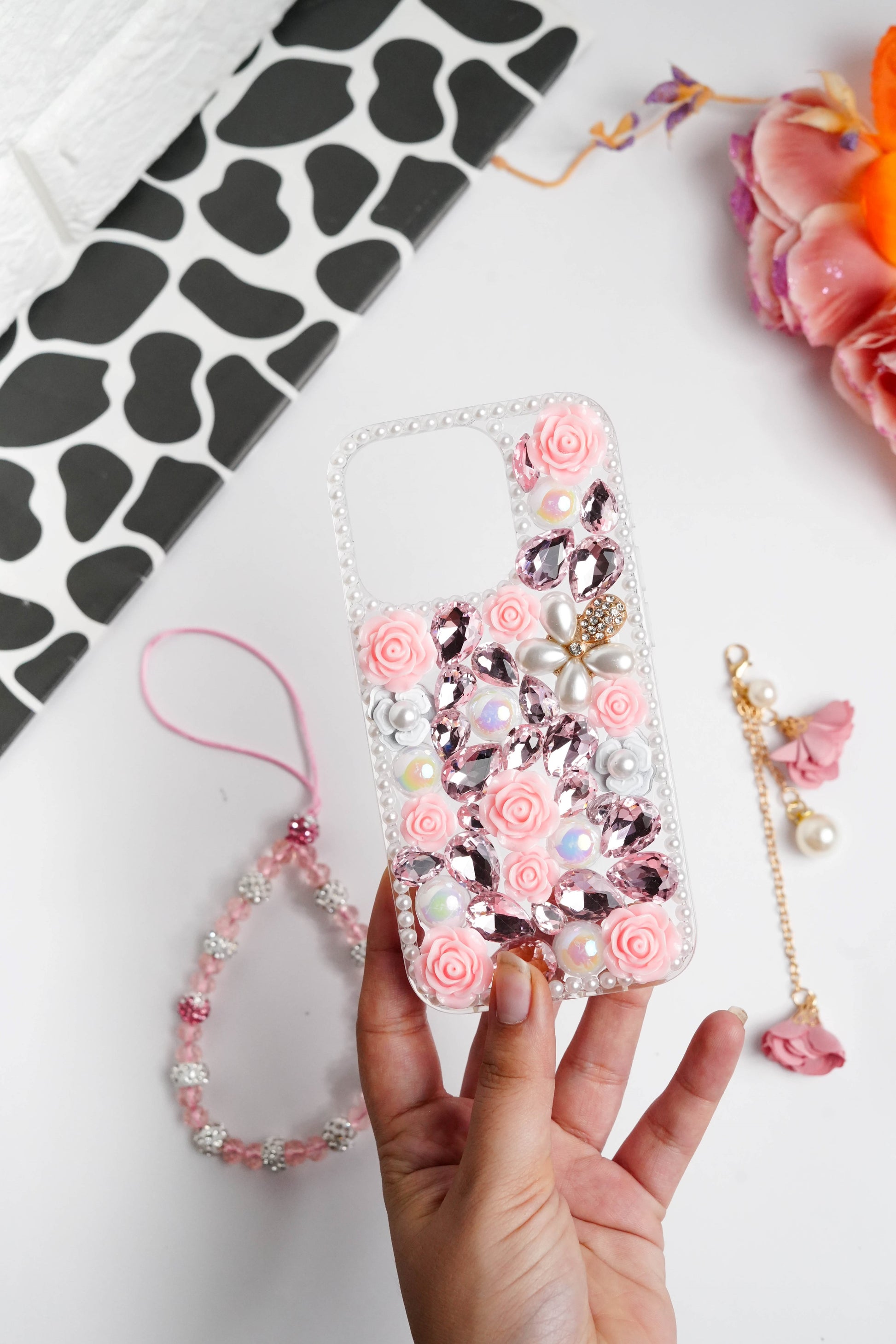 Pink Floral Diamond Bling With Pearl Floral Pendant Case for iPhone